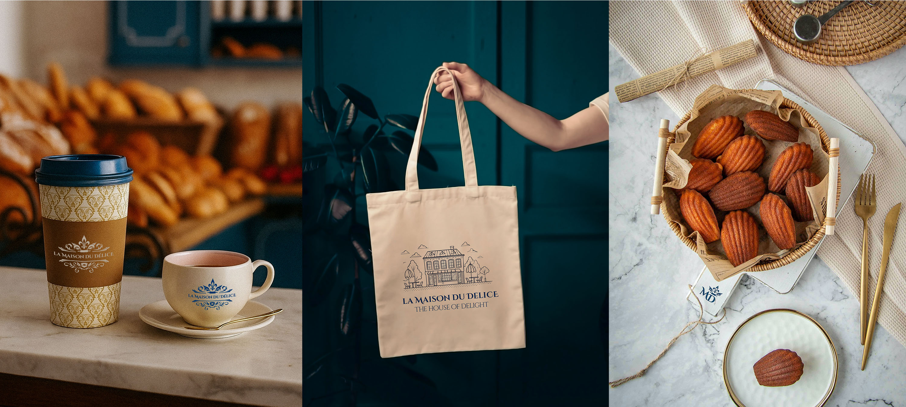 La Maison du Délice's colour palette is sophisticated and timeless, featuring soft pastel tones of blush pink, cream, and muted gold inspired by French patisseries. Navy blue grounds the lighter colours and is inspired by the national flag of France, adopted in 1794. These colors evoke a sense of elegance and refinement while maintaining a friendly and approachable feel.