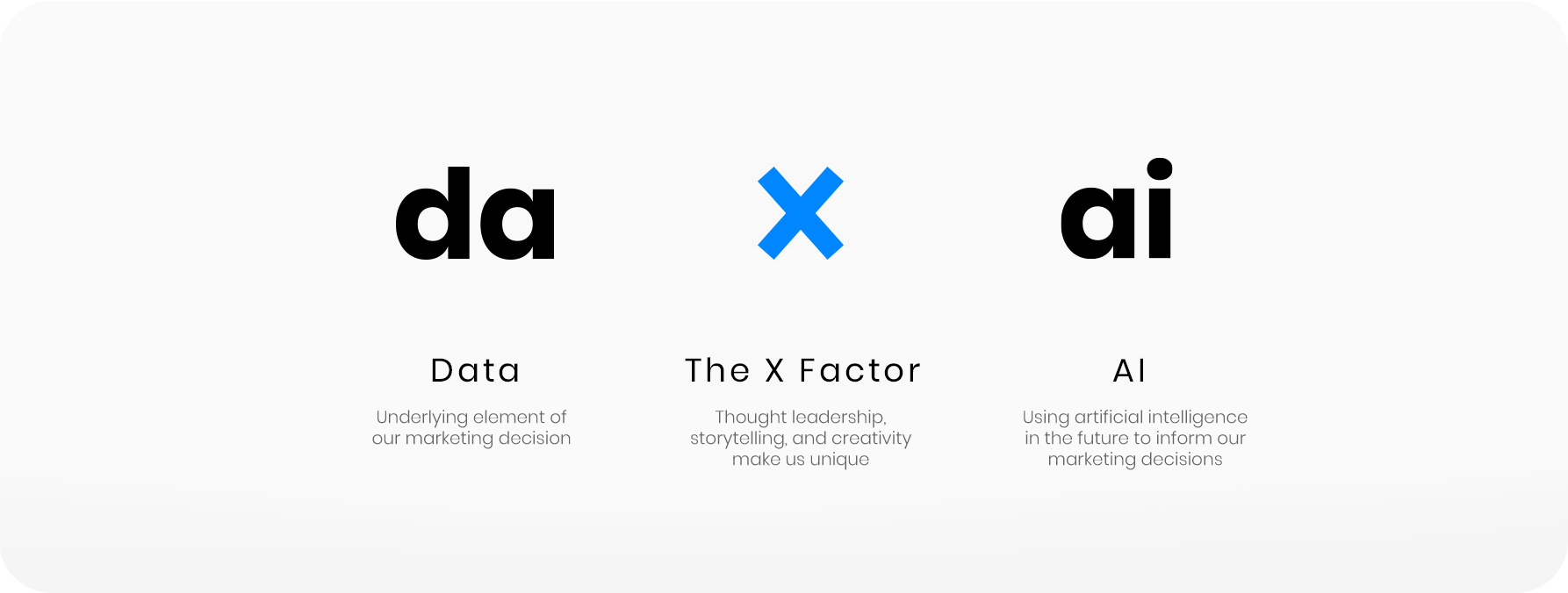 The daXai logo encapsulates the company's mission to bridge data, innovation, and artificial intelligence. The bold X introduces a dynamic contrast, symbolizing the unique value proposition—the X Factor—that daXai offers through storytelling and thought leadership. Its minimalist approach ensures timeless versatility across various media, making it a strong visual cornerstone for the brand's identity.