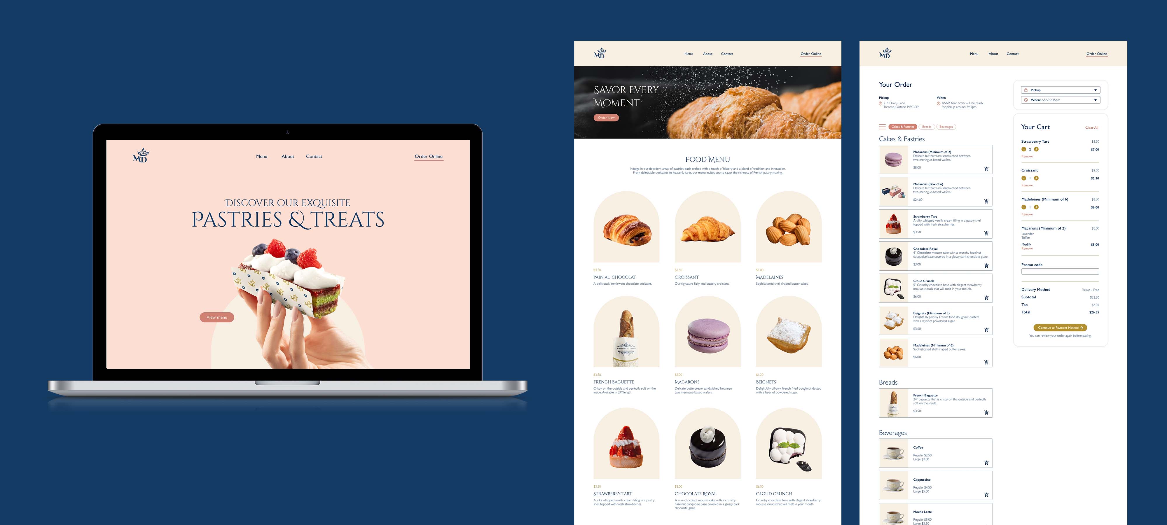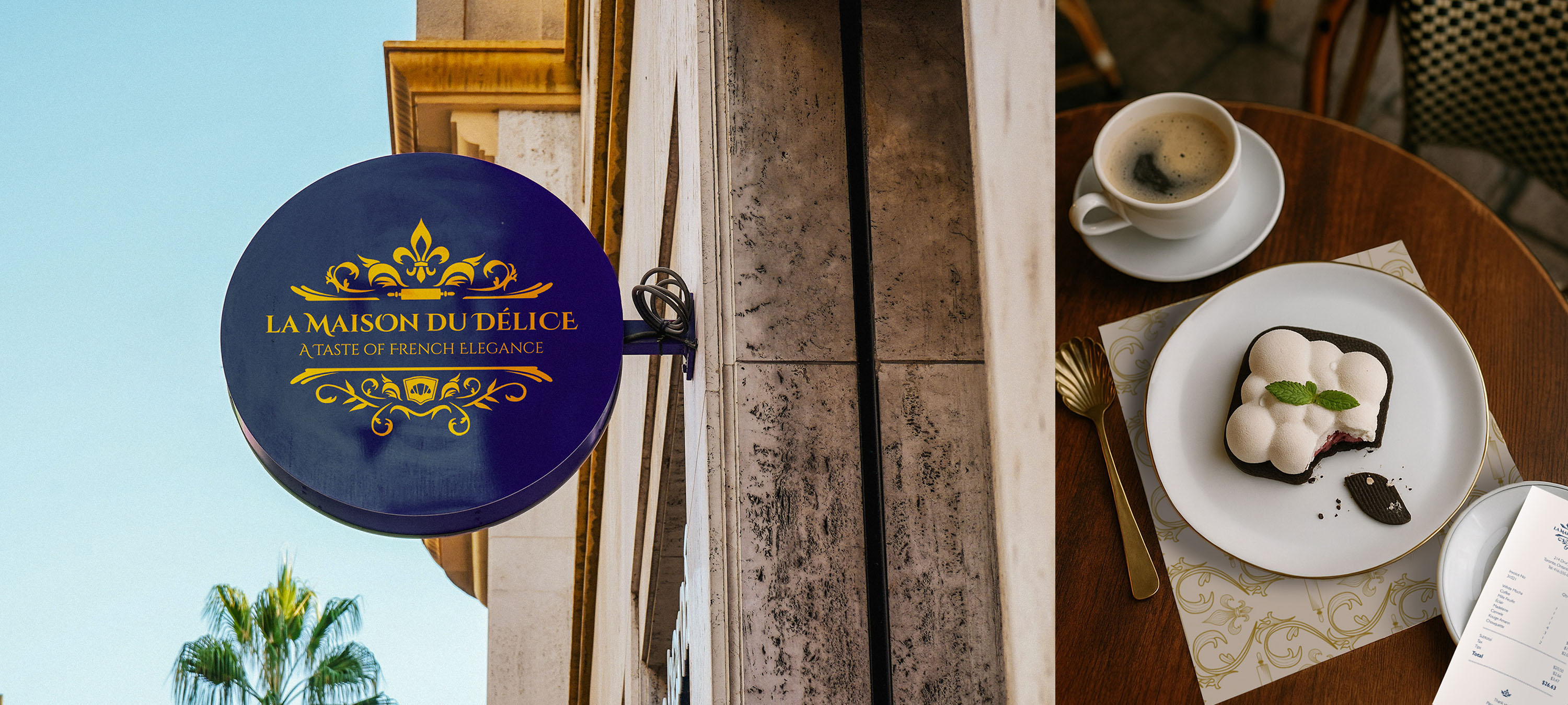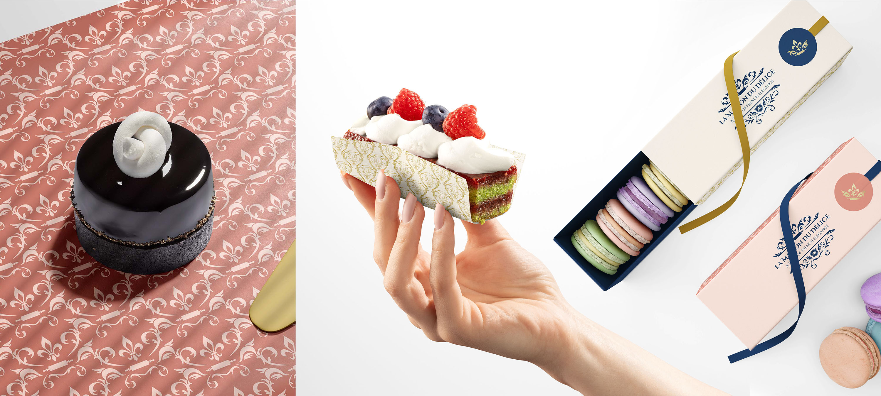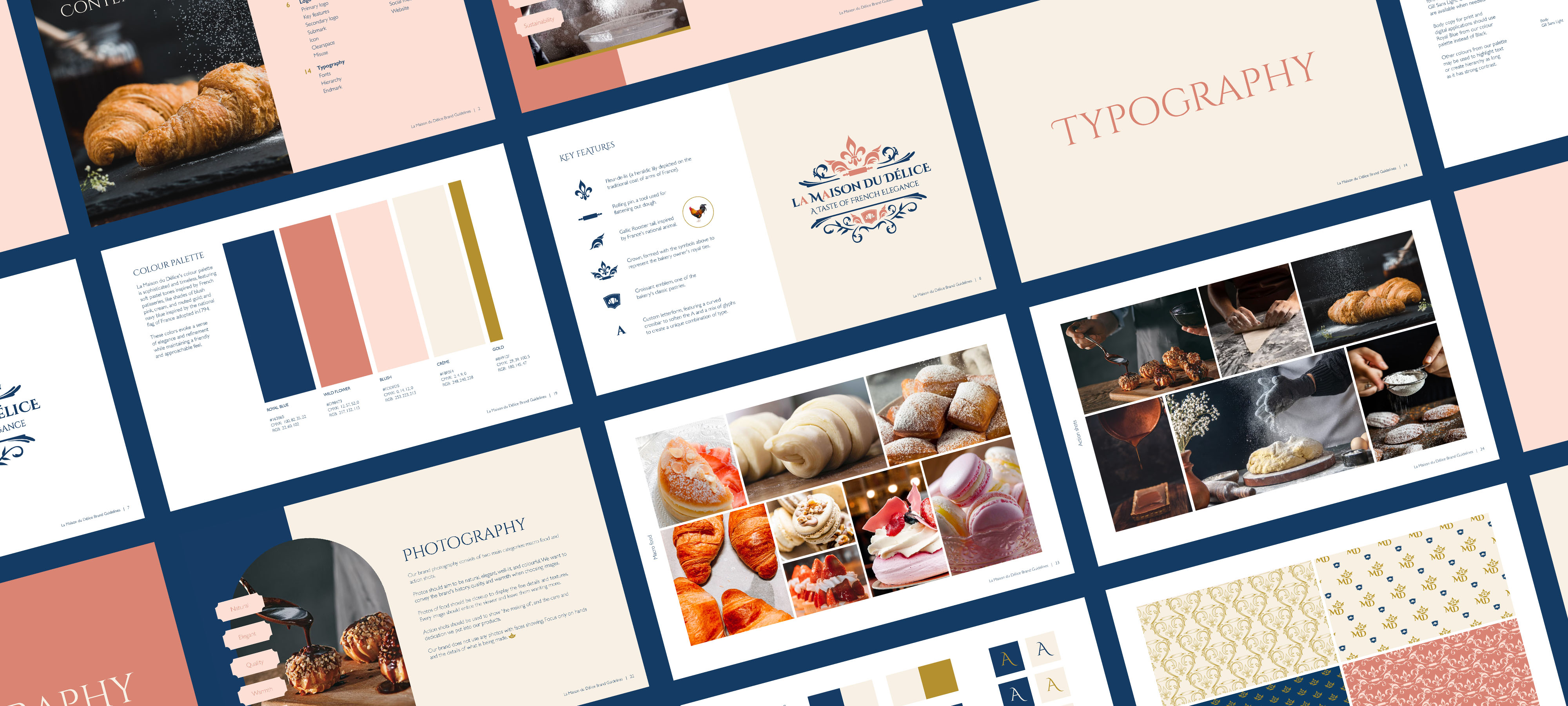 La Maison du Délice's colour palette is sophisticated and timeless, featuring soft pastel tones of blush pink, cream, and muted gold inspired by French patisseries. Navy blue grounds the lighter colours and is inspired by the national flag of France, adopted in 1794. These colors evoke a sense of elegance and refinement while maintaining a friendly and approachable feel.