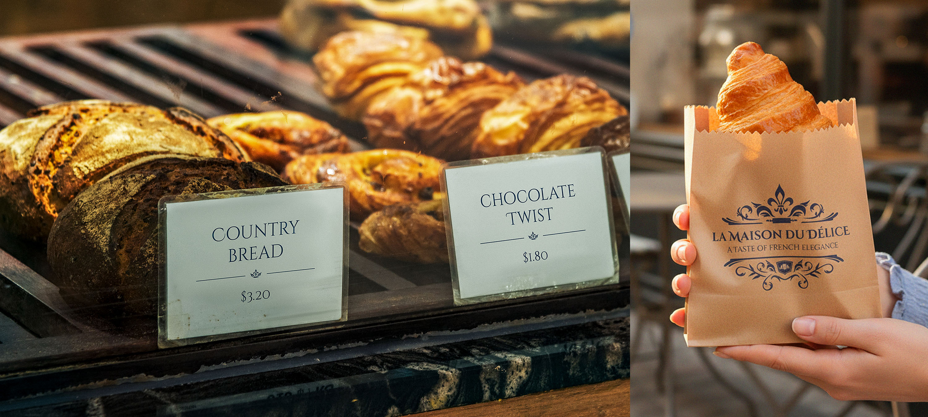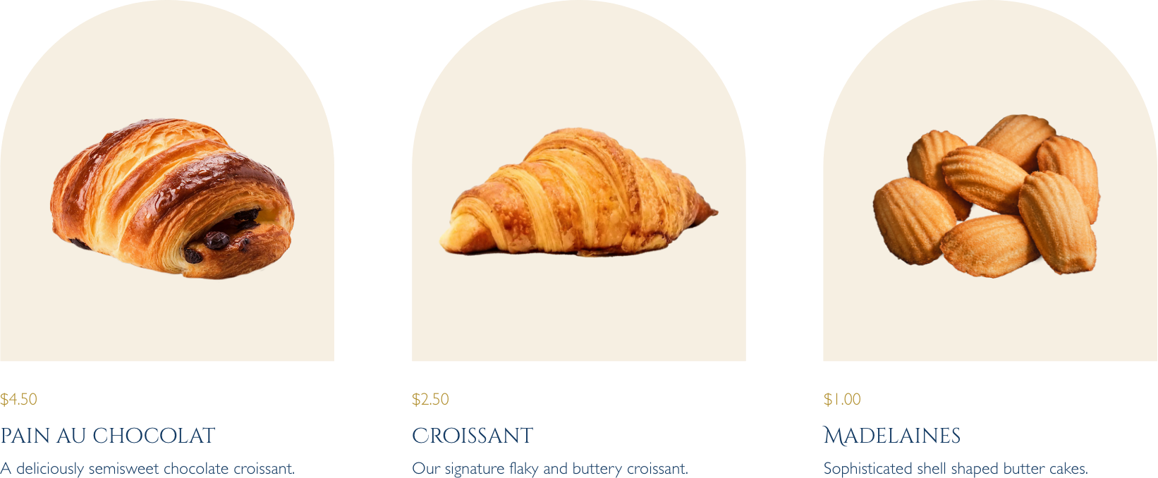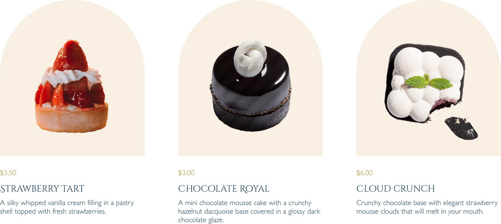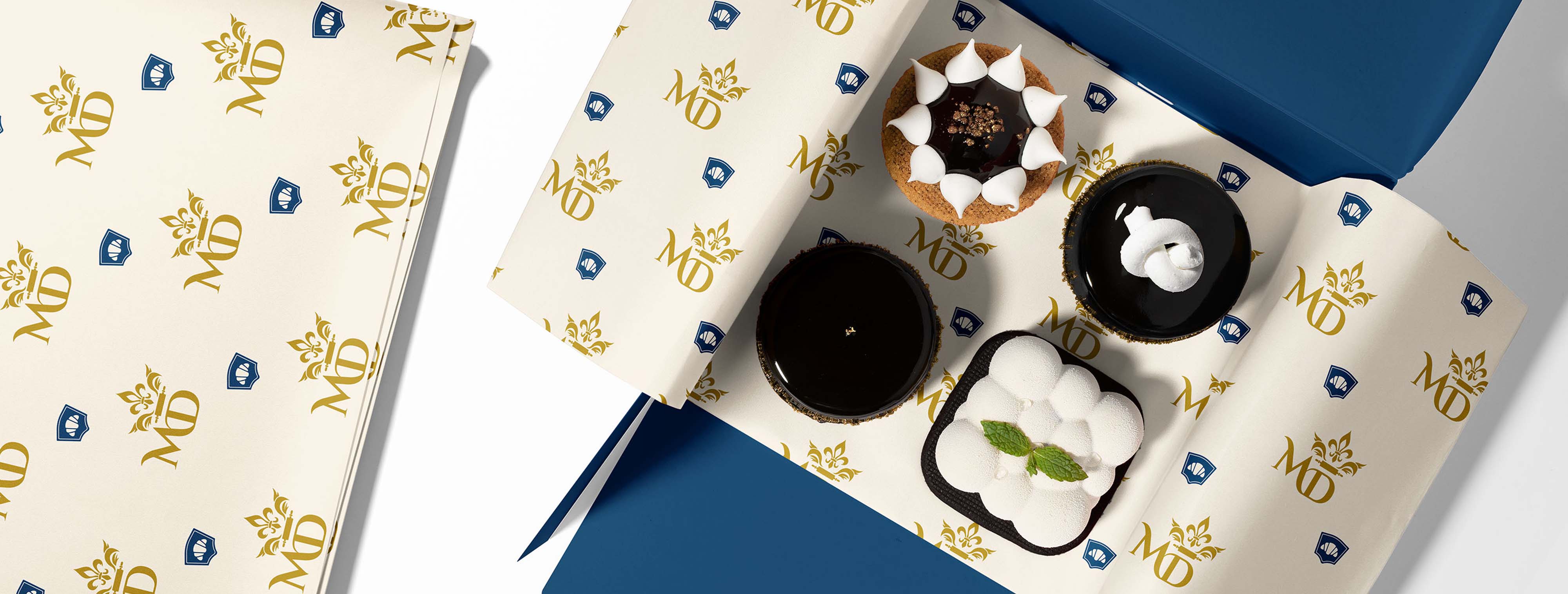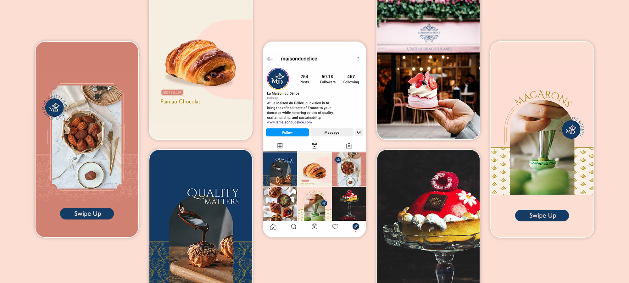 La Maison du Délice's colour palette is sophisticated and timeless, featuring soft pastel tones of blush pink, cream, and muted gold inspired by French patisseries. Navy blue grounds the lighter colours and is inspired by the national flag of France, adopted in 1794. These colors evoke a sense of elegance and refinement while maintaining a friendly and approachable feel.
