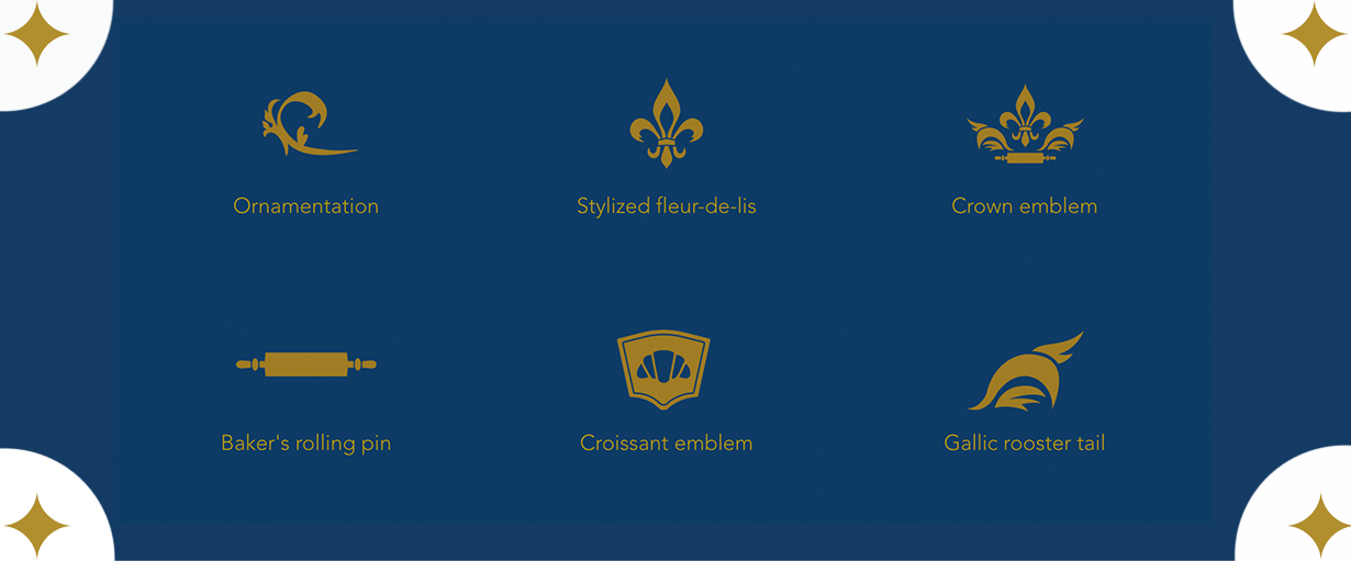 La Maison du Délice's logo is a crest reminiscing on the bakery owners french royal ties and rich history. Symbols are woven into the intricate logo. Brand patterns and social media profiles use a simplified submark of the logo and its elements.